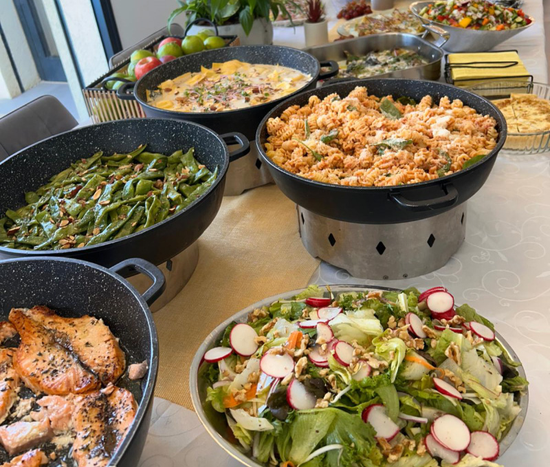 פלטות גבינות משובחות, סלטים טריים בעבודת יד, קישים מלוחים, לזניות, דגים, מאפים חמים וקינוחים שיגרמו לכולם לעצור לצלם.